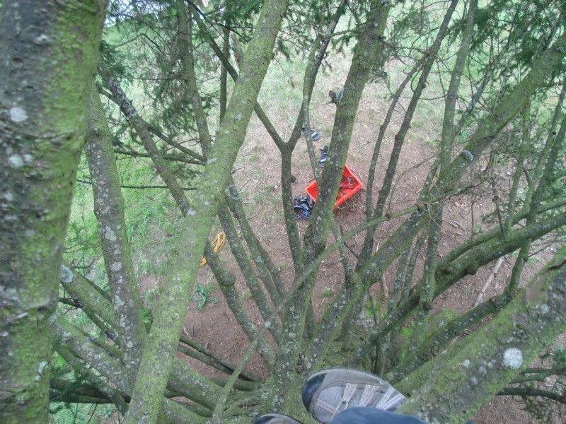 Gemeinsam einen Baum erklimmen, alle an einem Seil hängen.